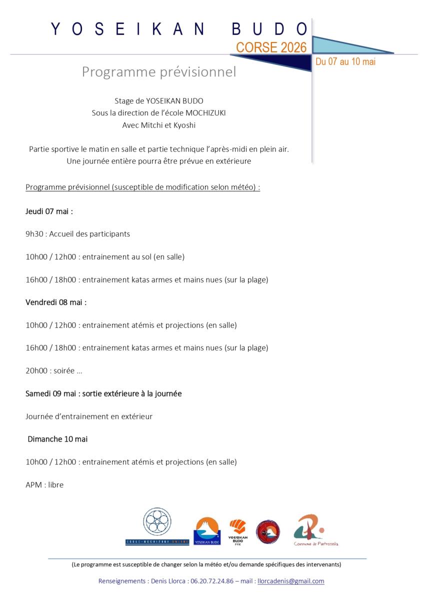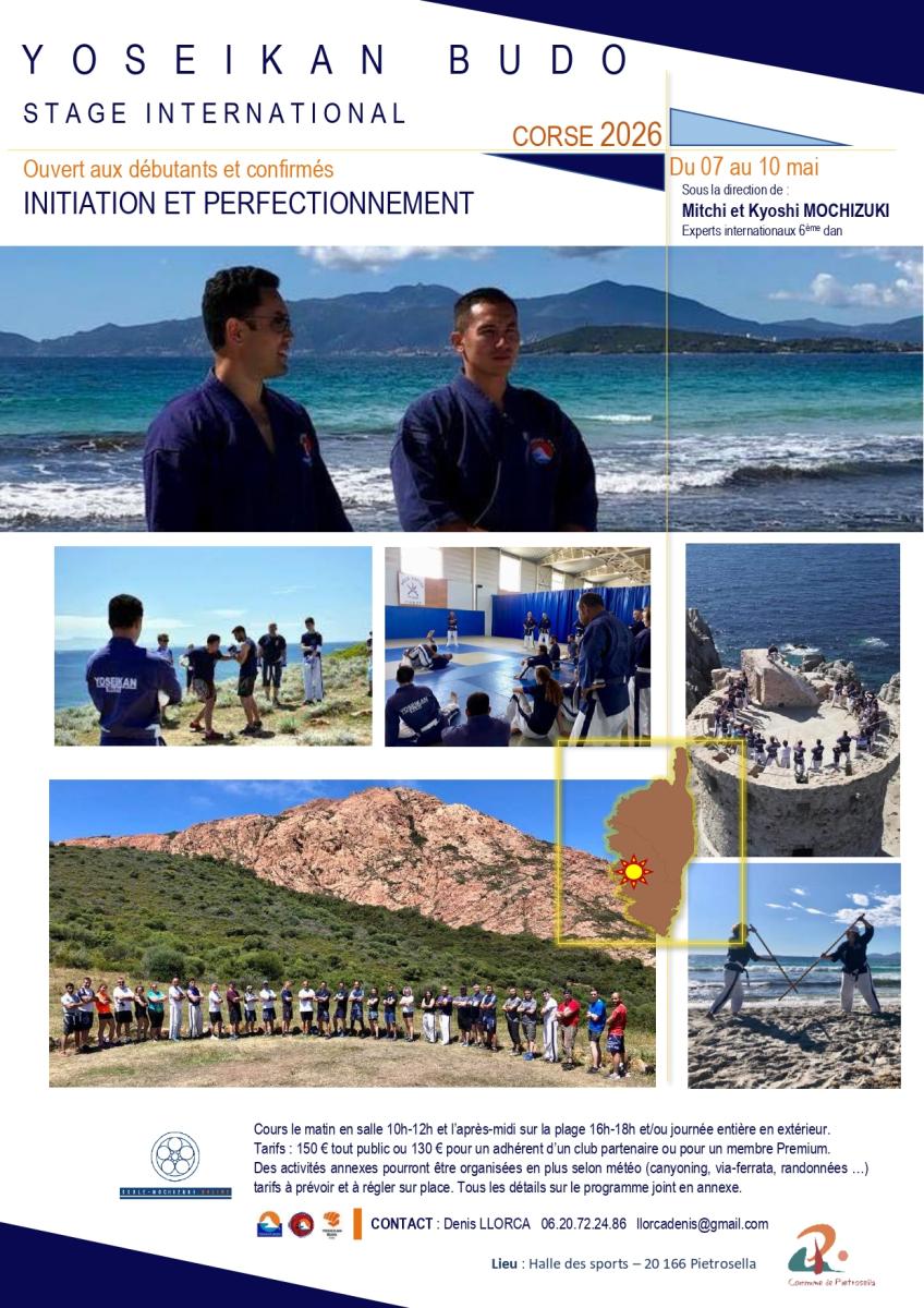 Stage de printemps en Corse à Ajaccio, pour tous les niveaux, de l'initiation au perfectionnement. Le stage se déroule en salle le matin et en extérieur l'après-midi, sous la direction de Mitchi et Kyoshi Mochizuki.
